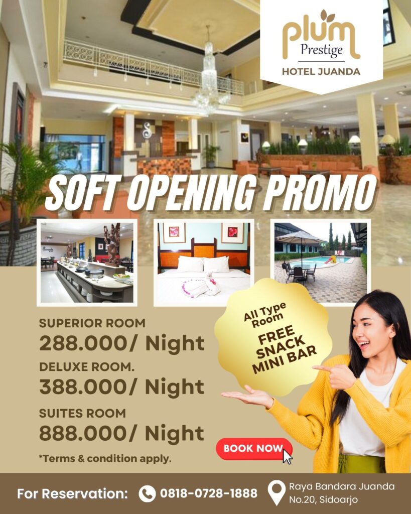 PLUM Prestige Juanda is a budget-friendly yet comfortable located just minutes from Juanda International Airport, offering free parking, complimentary Wi‑Fi, and an outdoor swimming pool. Its air‑conditioned rooms feature flat-screen TVs, private bathrooms, and 24-hour reception and room service for a hassle‑free stay
